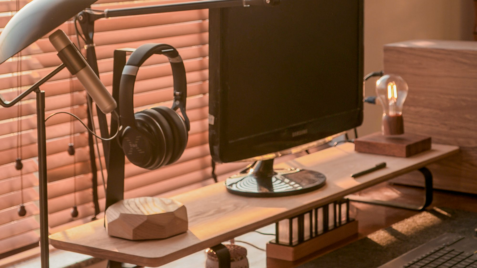 Keywords: desk, computer, lamp, workspace, office, study, home office, technology, lighting, furniture, workstation, desktop, setup, background, wallpaper