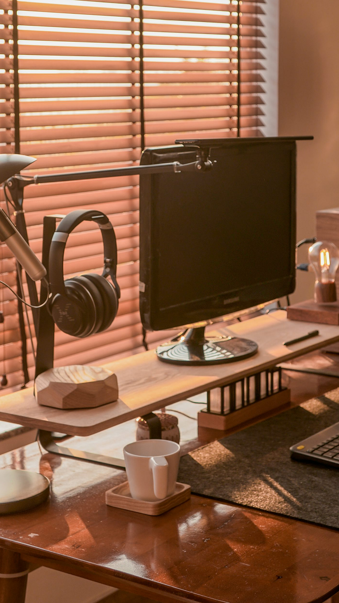 This wallpaper features a captivating image of a desk, complete with a computer and a lamp. The scene is perfect for those seeking a clean, professional, or home office-themed background for their devices. The lighting from the lamp casts a warm glow, enhancing the overall aesthetic appeal. The image is ideal for use as a wallpaper on various devices, providing a calm and productive vibe.