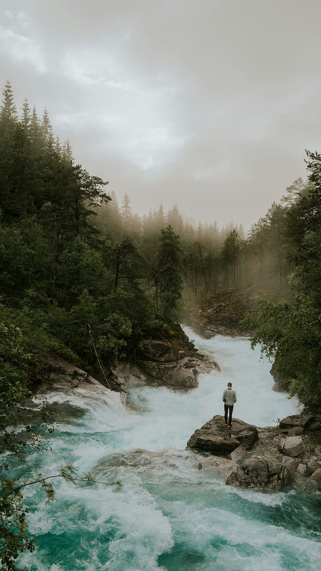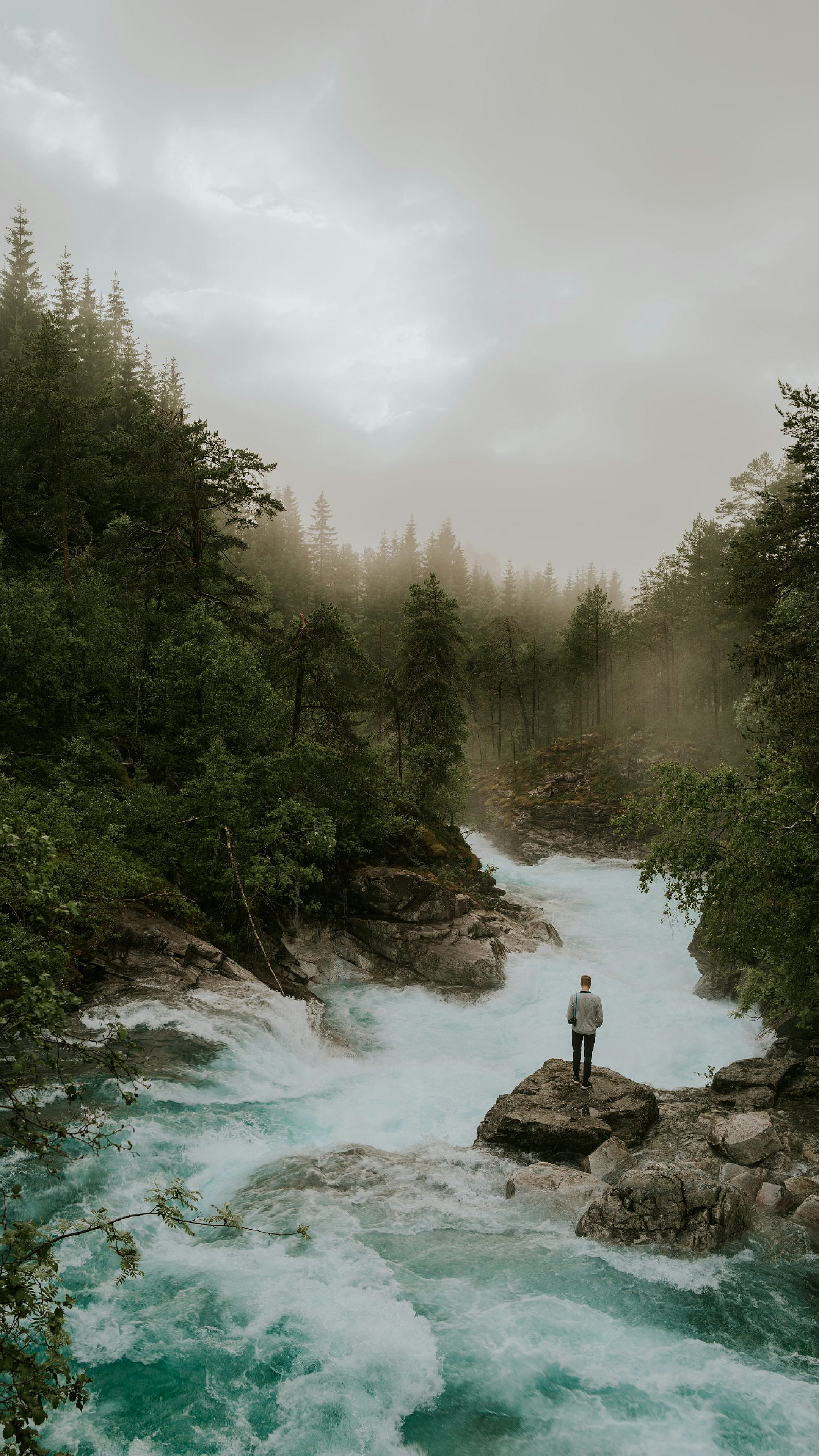 person, standing, rock, river, daytime, nature, landscape, scenery, outdoor, water, stone, standing figure, riverbank, solitude, peaceful
